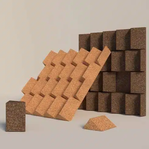 Geometric cork acoustic panels and shapes arrangement.