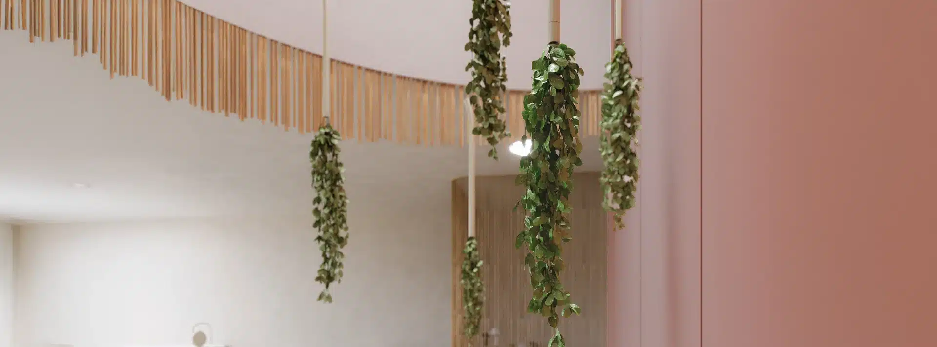 Cascade is een hangend decoratief element dat gepreserveerd bladgroen van bovenaf in het interieur brengt. Dankzij het modulair ophangsysteem en de sculpturale vorm voegt het een subtiele biofiele aanwezigheid en een uitgesproken designsignatuur toe aan elke ruimte.