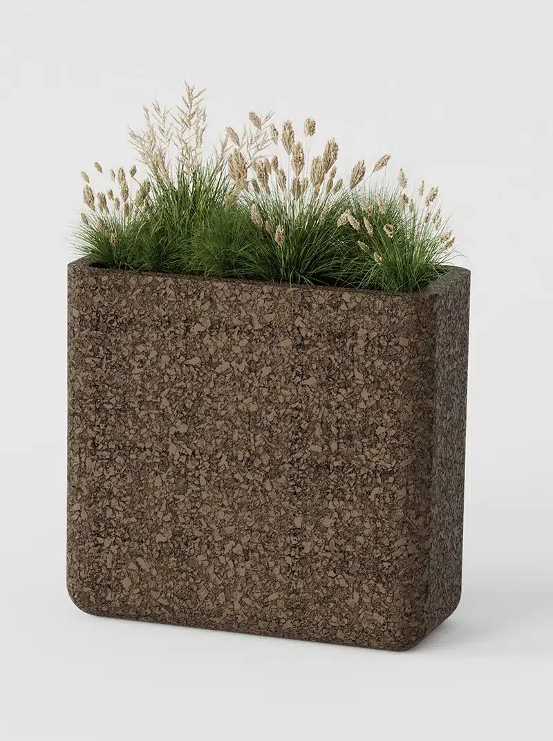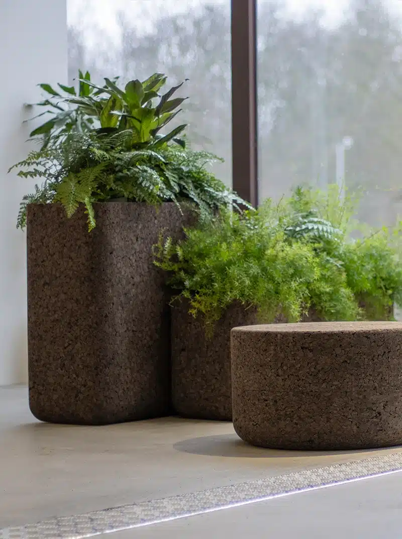 De Terra-plantenbak is een modulair indoor model in hernieuwbare geëxpandeerde kurk. Dankzij het veelzijdige design kan ze met een optioneel eikenhouten deksel worden omgevormd tot bank of tafel, voor groen én functionaliteit. Ideaal voor kantoren: ze verhoogt het akoestisch comfort en brengt de natuur naar binnen.