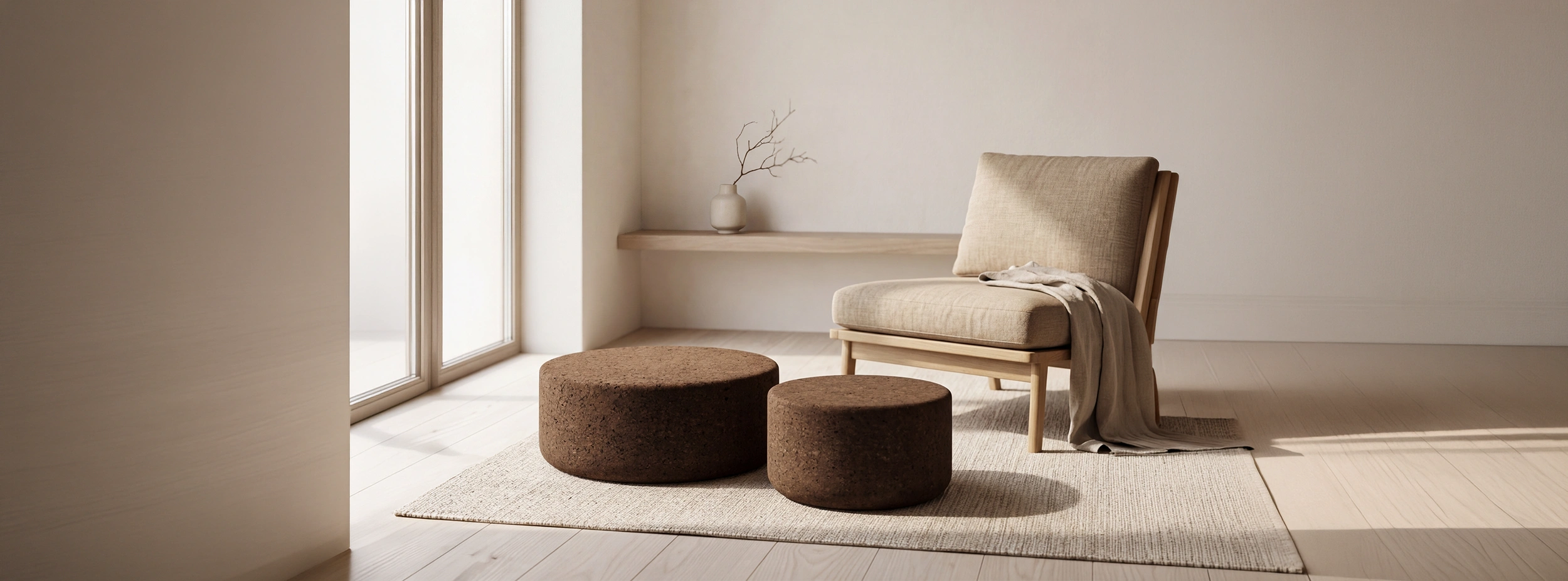 Gemaakt van geëxpandeerde kurk combineren onze poufs comfort, duurzaamheid en een ruwe, tactiele textuur. Elk stuk is lichtgewicht, hypoallergeen en van nature brandwerend, ideaal voor dagelijks gebruik in elke ruimte.